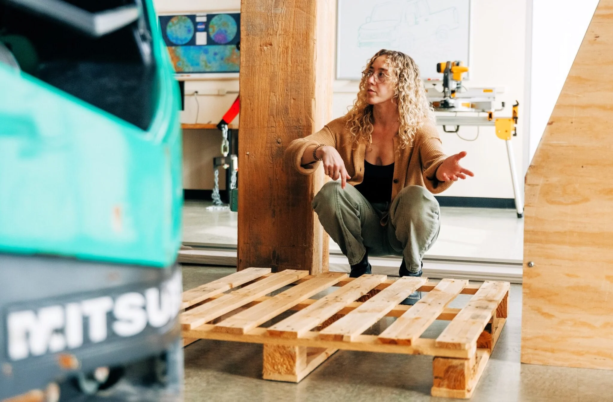 Special Teams’ founder and CEO, Clara Sekowski, discusses a hardware mockup build with teammates in the loading bay of their new 7,400-square-foot facility in Seattle’s SoDo neighborhood.